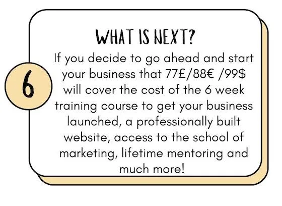 When you are creating an account you are accessing our platform, systems, community so you can have a taster of what it looks like to work with us. If you decide to go ahead and start your business this fee will cover the cost of the 6 weeks training course to get your business launched, a professionally built website, easy applicable automations that work for you, access to the school of marketing full or resources to have your business always up to date, access to all our chats, calls, replays and calls with 5, 6 and 7 figure leaders inside our team.